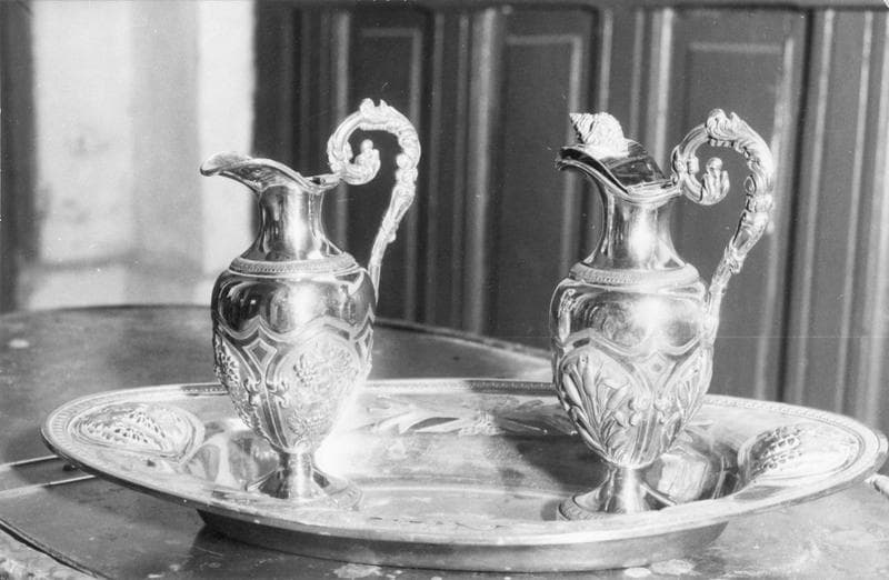 Bassin : le marli est orné de deux médaillons ovales représentant des grappes de raisin alternant avec des tiges de roseau nouées deux à deux par des rubans ; bordure ciselée de feuilles de laurier. Burette à eau : le couvercle, à charnière, a une prise en grain en forme de coquille ; la partie inférieure du corps est ornée de bouquets de roseaux ; l'anse en volute a des motifs de feuillages. Burette à vin : la panse est ornée de tiges de vigne.