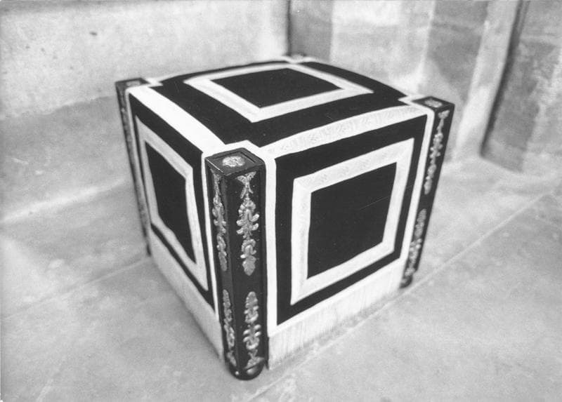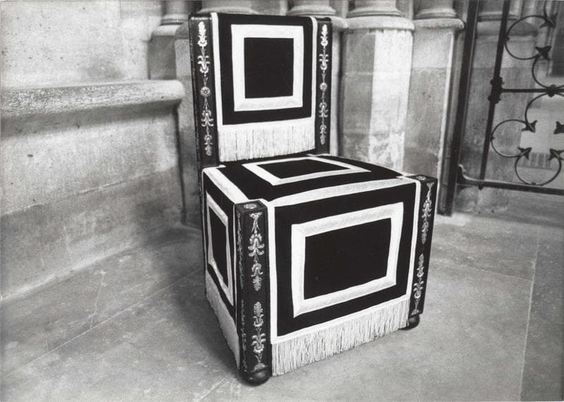Ensemble mobilier de choeur aux formes géométriques très massives. Le jeu des tissus noir et blanc souligne ce caractère.