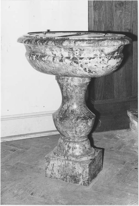Fonts baptismaux de marbre rouge. Le pied, en forme de balustre de plan ovale, repose sur un socle rectangulaire. La cuve, de plan également ovale, a un rebord mouluré d'un cavet sous un quart-de-rond renversé. Le double couvercle est en cuivre.