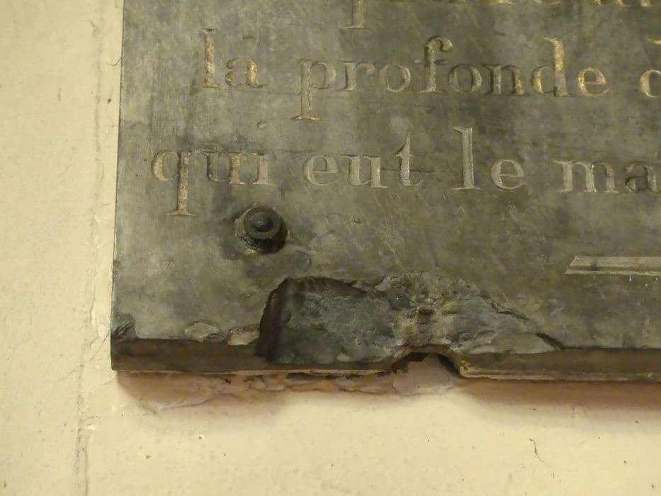 Dalle couronnée d'un fronton triangulaire entre deux palmettes et gravée d'une inscription commémorative. Décor du fronton (urne funéraire gravée) ; décor central (sablier entre deux ailes gravés)