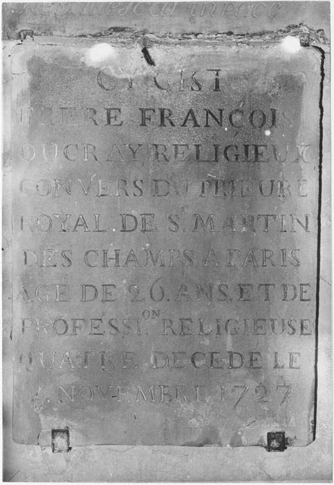 inscription funéraire : CY GIST / PIERRE FRANCOIS / DUCRAY RELIGIEUX / CONVERS DU PRIEURE / ROYAL DE ST. MARTIN / DES CHAMPS A PARIS / AGE DE 26 ANS ET DE / PROFESSION. RELIGIEUSE / QUATRE DECEDE LA 5 NOVEMBRE 1727