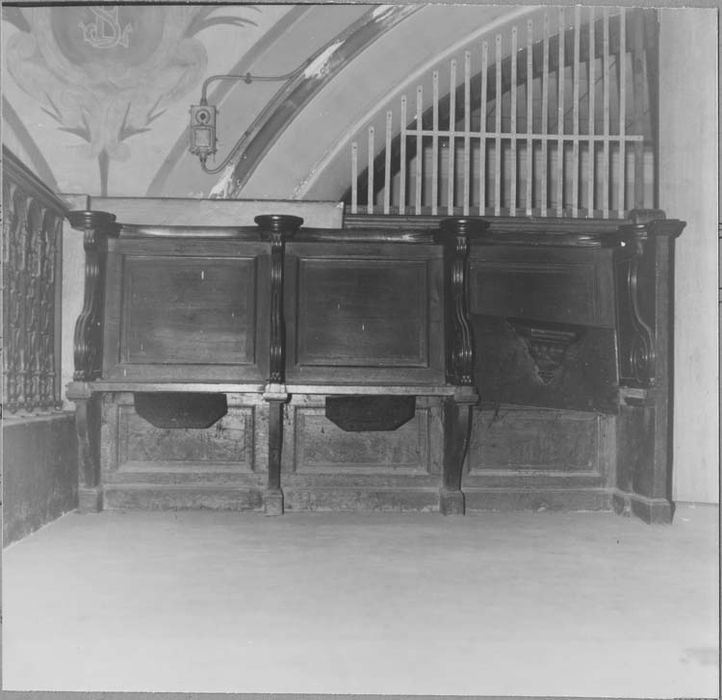 Stalles de choeur de 3 sièges sur un seul rang. Sellette mobile à miséricorde creusée d'un triglyphe. Les parcloses ne présentent ni mouluration ni ornement dans la partie inférieure, mais dessinent une moulure rentrante au niveau de l'appui-main.