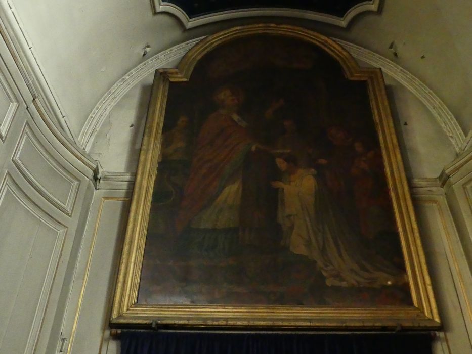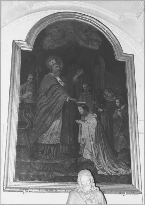 saint Médard ; évêque ; couronnement ; jeune fille ; agenouillé ; couronne ; rose ; intérieur ; église ; femme ; prêtre ; ange ; nuée