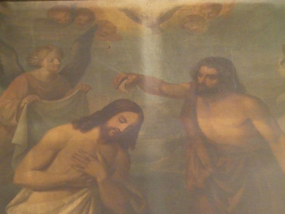 baptême du Christ ; saint Jean-Baptiste ; croix ; Christ ; draperie ; ange ; angelot ; colombe