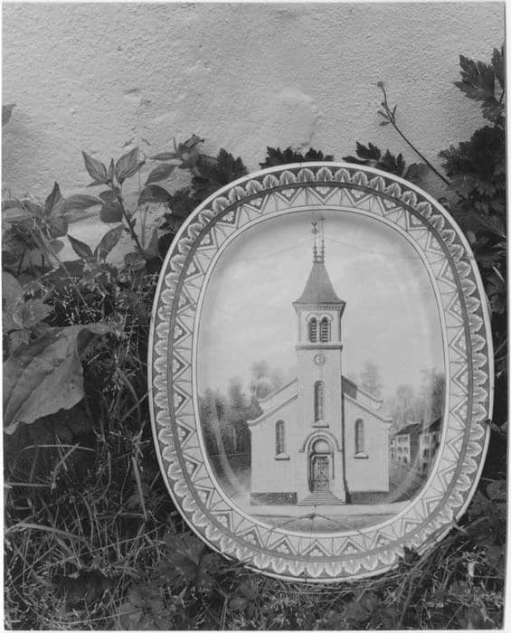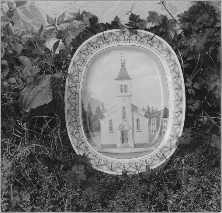 La frise du mali est géométrique sur l'un des plats avec un filet de glands sur un autre. Au centre : façade de l'église ancienne et nouvelle.