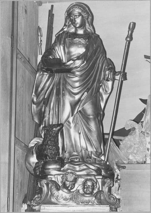 sainte Geneviève ; bergère ; en pied ; bâton ; mouton ; livre ; angelot