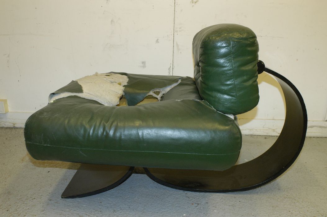 Six chaises de couleur vert Empire ; deux chaises de couleur marron ; un pouf de couleur vert Empire ; deux poufs de couleur marron. Piètements en bois collé, garnissage en mousse PVC, tapissés en cuir.