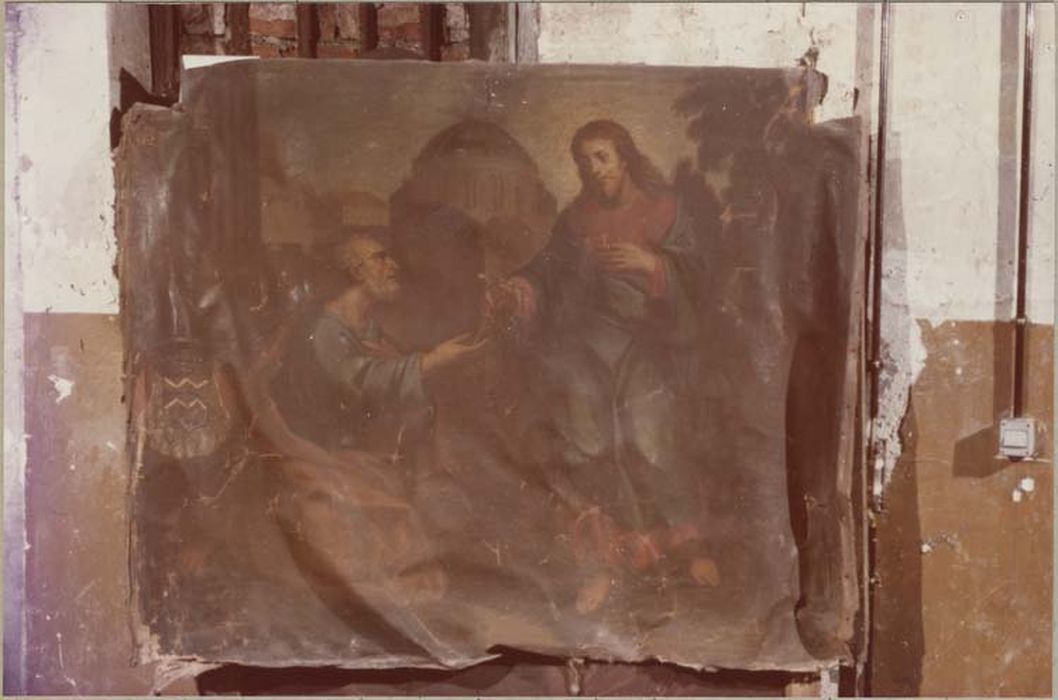 tableau : la Remise des clefs à saint Pierre avec les armoiries de la famille de Loyne