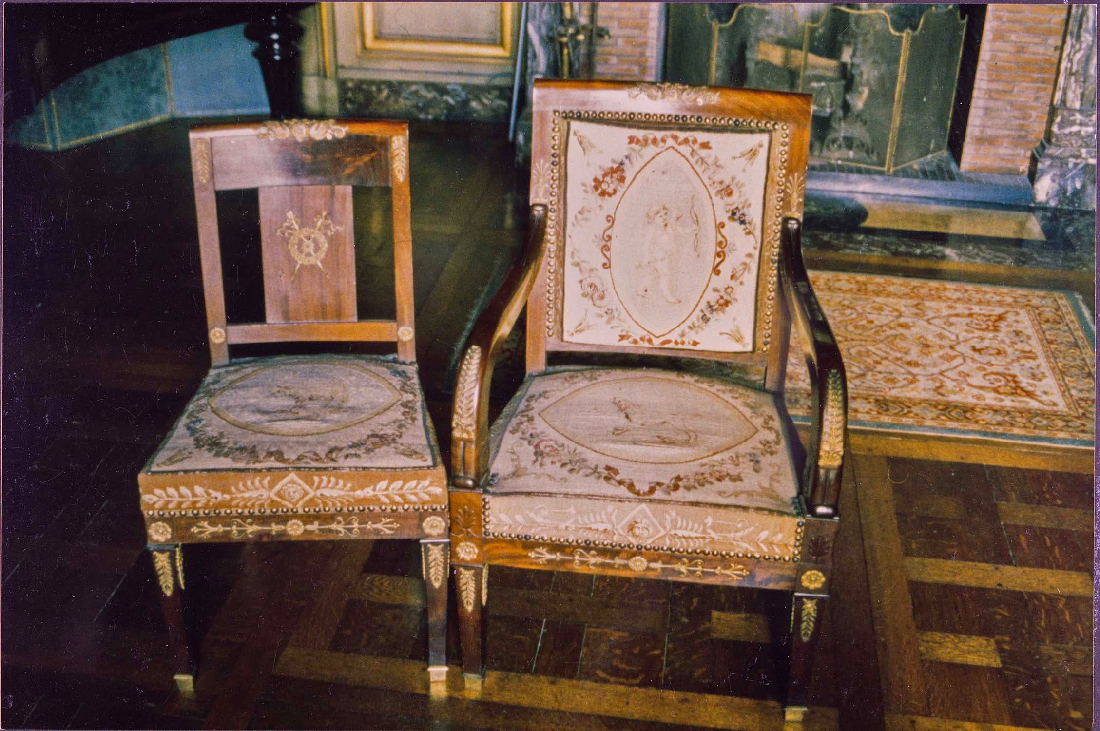 Les tapisseries des dossiers des fauteuils sont ornées d'un amour en médaillon, celles des assises, tant des fauteuils que des sièges, sont garnies d'un animal en médaillon également.