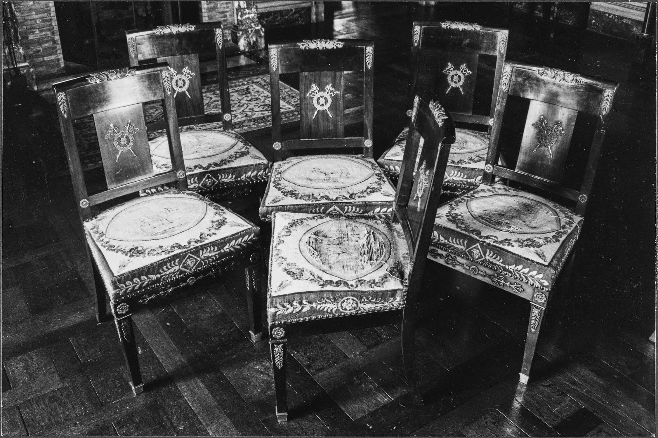 acajou : taillé ; bronze : doré ; textile : tapisserie au point