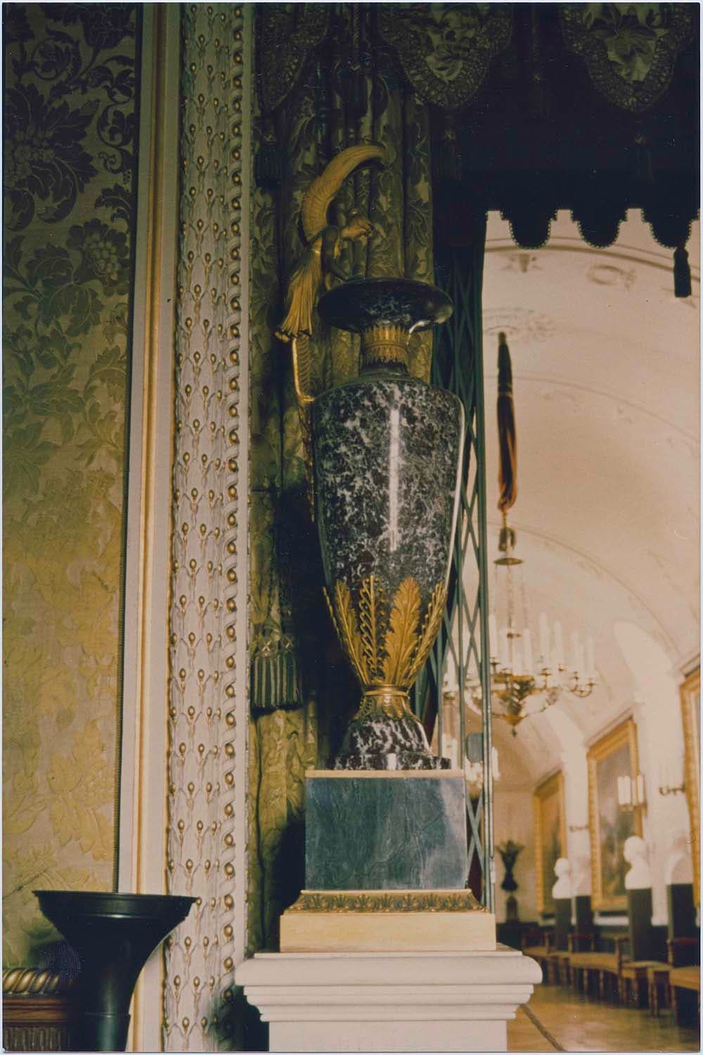 2 grandes aiguières en jaspe de Sibérie, socle en marbre, dotée d'une anse sous forme de Victoire ailée.