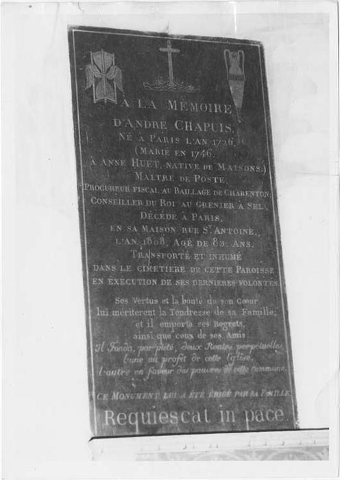 Epitaphe gravée : A LA MEMOIRE / D'ANDRE CHAPUIS, / NE A PARIS L'AN 1726. / (MARIE EN 1746, / A ANNE HUET, NATIVE DE MAISONS.) / MAITRE DE POSTE, / PROCUREUR FISCAL AU BAILLAGE DE CHARENTON; / CONSEILLER DU ROI AU GRENIER A SEL, / DECEDE A PARIS, / EN SA MAISON RUE ST. ANTOINE, L'AN 1808, AGE DE 83 ANS. / TRANSPORTE ET INHUME / DANS LE CIMETIERE DE CETTE PAROISSE / EN EXECUTION DE SES DERNIERES VOLONTES. / Ses vertus et la bonté de son coeur / lui méritèrent la tendresse de sa Famille ; et il emporta ses Regrest, / ainsi que ceux de ses Amis / Il fonda, par piété, deux Rentes perpétuelles, / l'une au profit de cette Eglise, / l'autre en faveur des pauvres de cette commune. / CE MONUMENT LUI A ETE ERIGE PAR SA FAMILLE / Requiescat in pace.