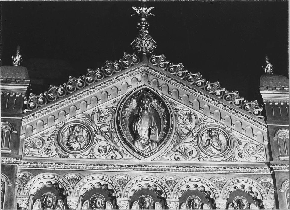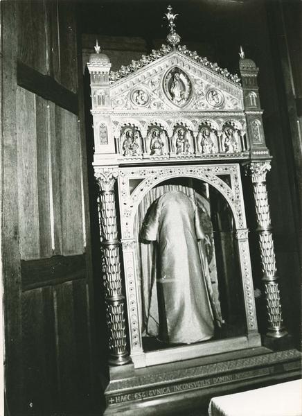 Reliquaire contenant le fac similé de la Sainte Tunique, en cuivre doré et cabochons. Châsse représentant le frontispice d'un édifice pseudo-roman. Edicule formé de deux colonnes palmiformes surmontées de tours carrées à trois niveaux et soutenant : un entablement orné d'une arcature abritant des anges à mi-corps tenant les instruments de la Passion ; un fronton brisé ouvert d'une mandorle avec Christ enseignant et deux médaillons avec des anges. Par l'ouverture en plein-cintre inscrite dans un rectangle, le tout orné de cabochons, on aperçoit le fac similé de la Sainte Tunique.