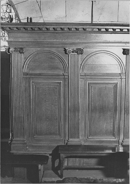 Ensemble des boiseries du choeur. Formé de quatorze travées situées de part et d'autre du retable central, avec retour en equerre sur la dernière travée. Les travées externes vers le retable sont incomplètes. Chaque travée présente un rectangle mouluré surmonté d'un arc en plein-cintre. Les travées sont séparées par seize pilastres ioniques cannelés, soutenant un entablement à corniche débordante et reposant sur un soubassement à panneaux rectangulaires.