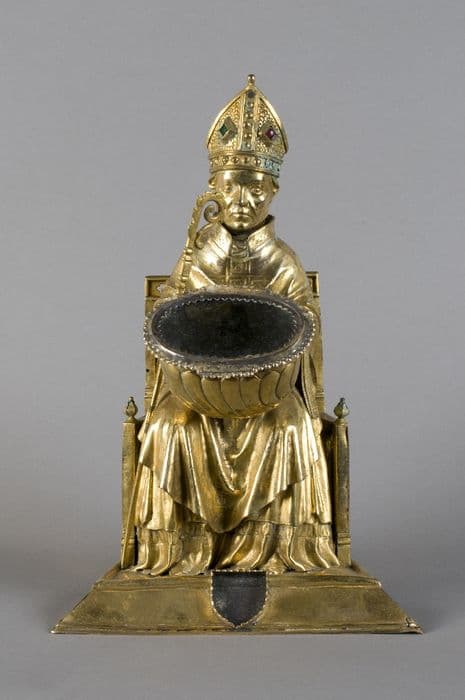 Reliquaire de Saint-Vivien. L'évêque, en habits pontificaux, la tête mitrée, est assis sur un siège à dossier ajouré de quadrilobes.