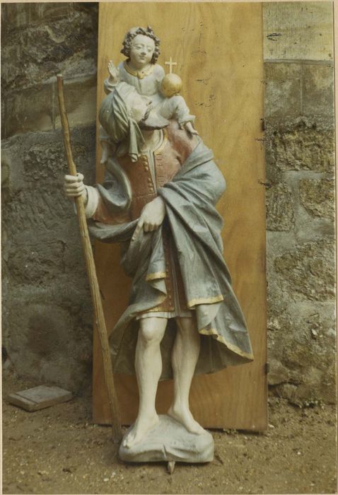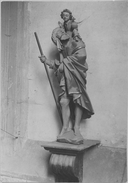 Cette statue de saint Christophe était présentée en pendant d'une statue de sainte Barbe en bois polychromé du 16e siècle (non protégée au titre MH), volée suite à sa mise à l'abri lors de travaux de consolidation du clocher, en 1904-1905, cf. notice Mémoire : https://www.pop.culture.gouv.fr/notice/memoire/APMH045800