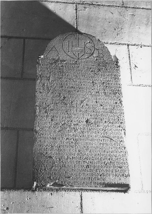 Pierre arrondie du sommet pour encadrer le monogramme IHS surmonté d'une croix.