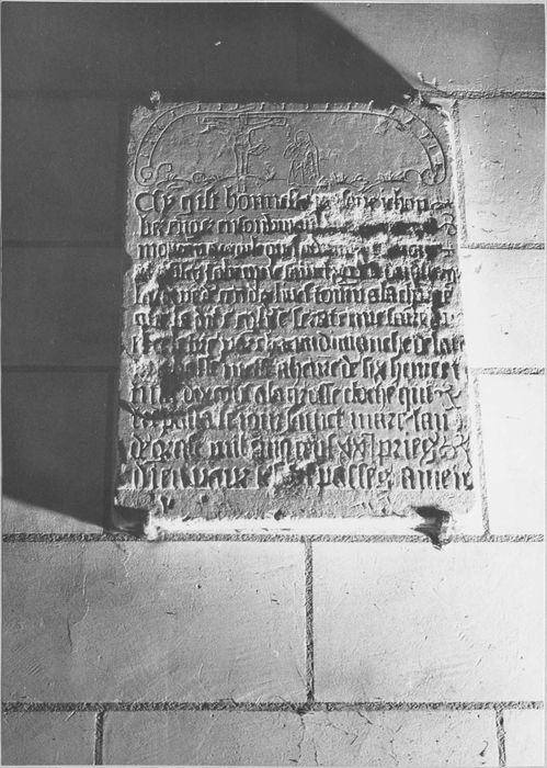 Inscription (incomplète) : Cy gist honneste personne Jehan Berenger, en son vivant vigneron, demeurant à Cergy ... trepassa le jour sainet Marc, l'an de grase mil cinq cent xxj. Date : 1521.