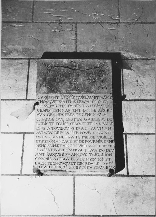 Inscription (incomplète) : Cy gisent Xpofle Dubray et Marie Chouquet, sa femme ... assis aux grands prés de Gency ... contrat passé par devant Jacques Françoys, tabellion commis à Cergy, le 7 de may 1611 ... ladicte Chouquet décéda le 26e febvrier 1605. Date : 1605.