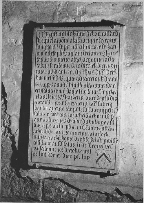 Armoiries : d'argent, au chevron d'azur, accompagné en chef de deux cosses de genêt de sinople, et en pointe d'une tête de Maure de sable, tortillée du champ, armoiries des Cossart (en bas à droite, dans un écu fantaisiste). Inscription (incomplète) : Cy gist noble homme Jehan Cossard, ... lequel trespassa le iiije jour d'octobre mil Ve lvij ...à la prarie de Han ... une messe de Requiem à diacre, soubz diacre et chappes, ... pour ce faire, sera tenue la dicte fabrique bailler au curé, tant pour lesditz services que pour lesditz salutz, XXXV s. t. aux officians, chacun iiij d. p. aux aultres gend d'Eglise du villaige assistants et portans surplis audit service et enffans, à chacun iij s. t.
