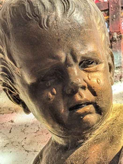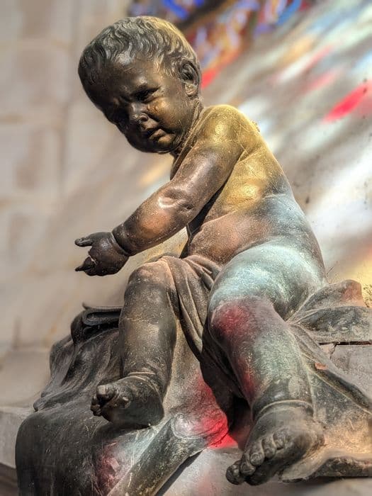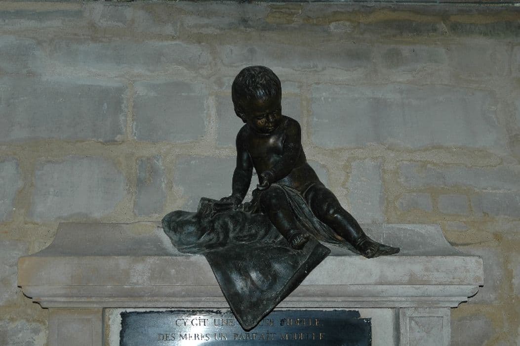 Petit monument funéraire surmonté d'une figure d'angelot tenant un flambeau.