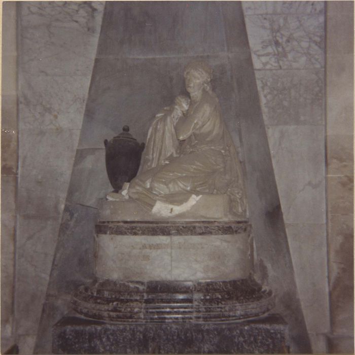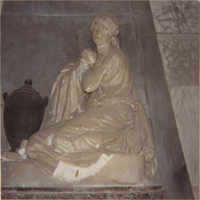 Monument funéraire : cippe de marbre avec statue en plâtre et médaillon ovale en marbre.