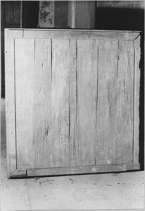 Panneau peint formé de sept ais de chêne, celui du centre étant moins large que les autres.