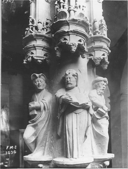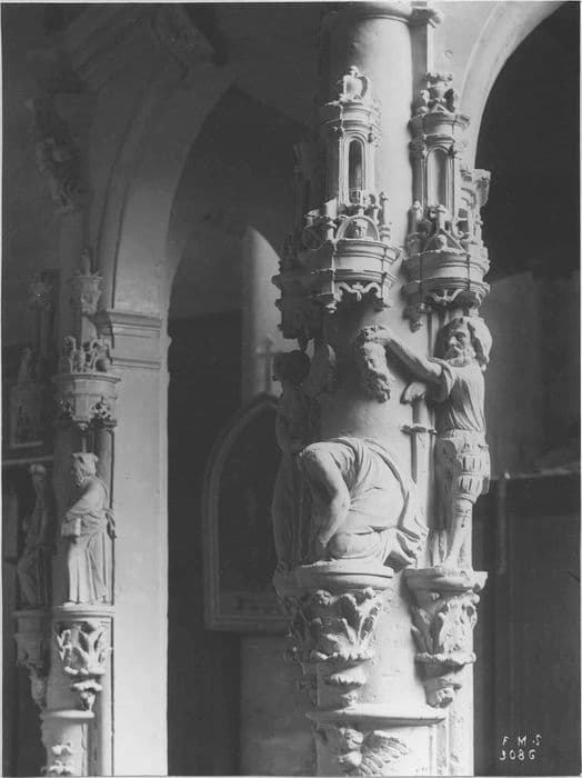 Fonts baptismaux surmontés d'un baldaquin. Composés d'une cuve hexagonale reposant sur son piédestal hexagonal. L'édicule qui recouvre les fonts baptismaux comprend un soubassement supportant six colonnes reliées entre elles par des arceaux, au-dessus desquels règne une galerie ornée de statues : la Force, la Justice, la Science, la Vertu, etc. Le dôme qui recouvre l'ensemble est couronné par une statue de Saint Jean-Baptiste, probablement moderne. Sur les fûts des colonnes, de petits encorbellements soutiennent des groupes de statuettes : les Evangélistes, Sainte Véronique, la Décollation de Saint Jean-Baptiste, etc.