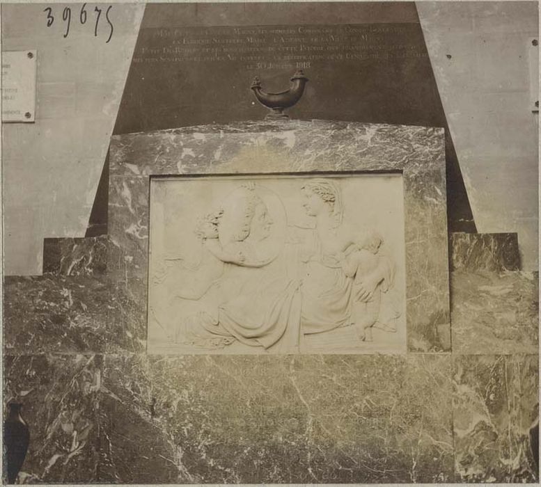 L'amphore d'applique en bronze doré, côté dextre, a disparu. Problème d'humidité affectant la structure du monument : cassure et manque sur le gradin à gauche. Nécessité de refixer et consolider les parties fragilisées.