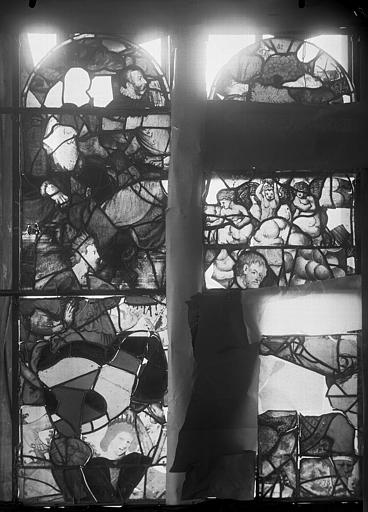 Vie de saint Nicolas, Présentation d'Anne de Montmorency et de ses fils, Présentation de Madeleine de Savoie et de ses filles, la Mort de la Vierge : verrières démontées pendant la guerre ; mauvais réassemblage, surtout dans les registres supérieurs. Pentecôte : assez bon état. Sacrifice d'Abraham et Cène : assez bon état, grisaill en voie d'effacement à certains endroits. Vierge à l'enfant avec donateur et Sainte Trinité : assez bon état, verre de casse.