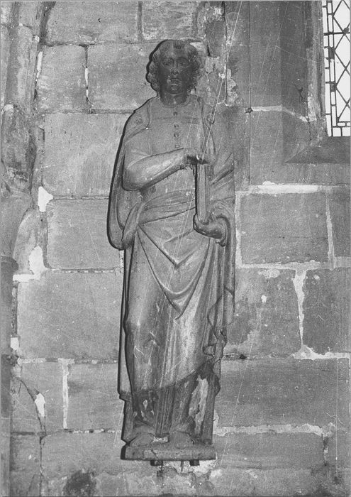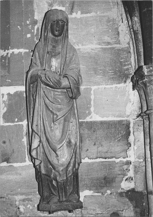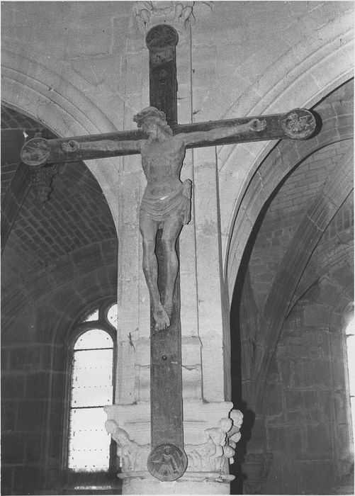 Polychromie moderne. Le crucifix est dans la nef, la Vierge et Saint Jean sont fixés au mur du croisillon Sud.
