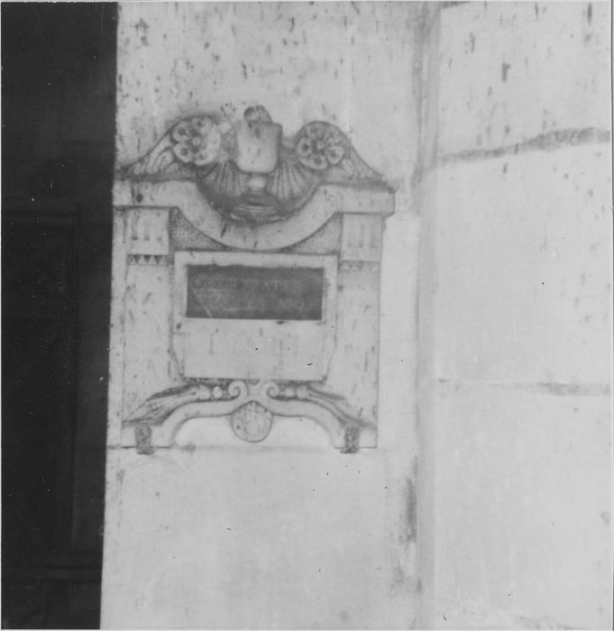 Epitaphe. Cette inscription commémorative sur marbre noir est encadrée de deux petits pilastres que surmonte une guirlande avec des fleurettes et des coquilles.