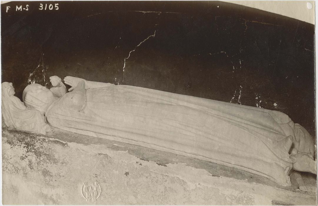 Statue funéraire de femme dans un enfeu. femme couchée, revêtue du costume monastique, la tête reposant sur un coussin, deux anges à ses côtés et aux pieds, une rosette (?).