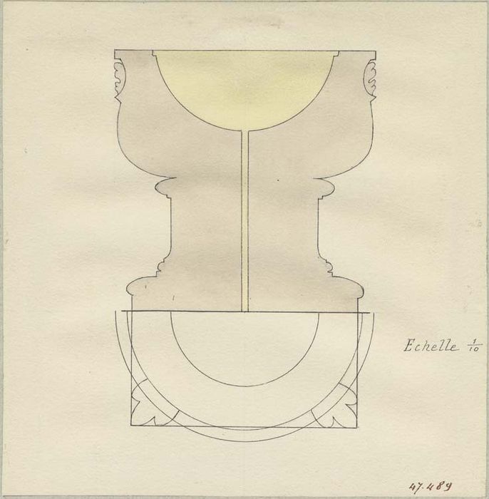 Cuve ronde portée par un pied incurvé en sa partie moyenne, orné de moulures. La cuve est bordée en sa partie supérieure d'une frise de feuilles de chêne. Cuve intérieure en plomb.