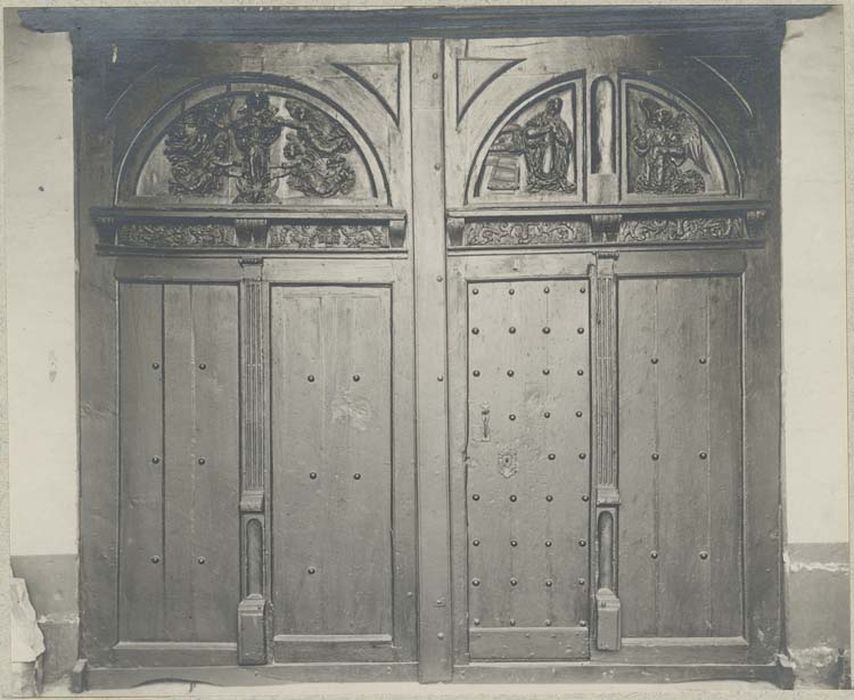 Porte principale. Porte à deux vantaux, dont chacun est divisé sur la plus grande partie de sa hauteur à partir du bas, en deux panneaux encadrés d'une simple baguette et séparés par un pilastre cannelé et creusé d'une niche dans sa partie inférieure. Au-dessus, dans le sens de la longueur, une frise composée de rinceaux de feuillages et séparée, au-dessus des pilastres déjà indiqués, par un double modillon en forme de talon, décoré de feuilles d'acanthe. Aux deux extrémités de chaque frise, semblable modillon. Sur ces modillons repose une imposte semi-circulaire, où sont représentés des bas-reliefs : l'Assomption et l'Annonciation.
