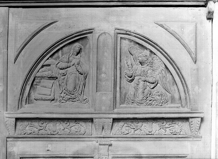 pilastre, niche ; frise : rinceau, feuille d'acanthe ; Assomption, Annonciation
