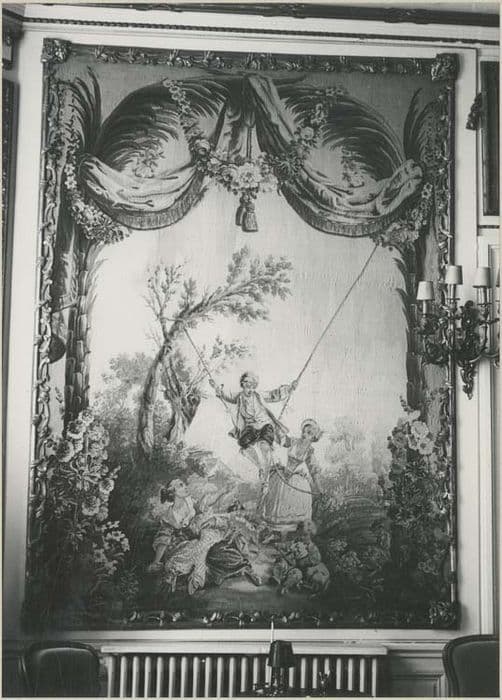 Scènes champêtres et jeux d'enfants : un dénicheur de nids, cueillette de fruits par un jeune homme monté dans une échelle dans un arbre, l'escarpolette et mat de cocagne. En haut, draperies et guirlandes de fleurs.