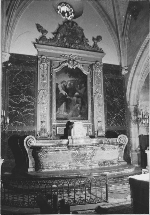 Maître-autel, son emmarchement et retable. La table de l'autel est en bois. L'autel, de forme tombeau, en marbre veiné de noir, de vert et de blanc, appuyé sur une partie en marbre rose veiné, légèrement incurvé et plus élevée, formant gradin, terminée par des volutes en corne de bélier. Emmarchement de trois degrés en marbre rose veiné dont la partie horizontale supérieure est décorée au centre d'un cercle divisé en quatre secteurs blancs et bleus. Le retable est adossé au mur du chevet plat, formé de deux montants en pilastres soutenant un entablement couronné d'un fronton à lignes incurvées. De part et d'autre, des boiseries peintes en faux-marbre vert sombre veiné de blanc. Au centre du retable, tableau dans un cadre doré à partie supérieure en chapeau de gendarme et orné de deux têtes d'anges. Les montants sont symétriquement décorés : à la base, feuilles d'acanthe en console renversée, au sommet, coquille accostée de deux volutes, cordon où pendent médaillons et trophées ; à dextre, un calice, deux buires et des pampres de vigne, puis un ostensoir, un ciboire, un cierge et des épis de blé et dans le médaillon, Saint Pierre ; à senestre, un crucifix, une palme, un livre, puis une paire de chandeliers, un plateau, un encensoir et un manipule et dans le médaillon, Saint Paul. Au fronton, le delta entouré d'une gloire rayonnante, de nuages et de têtes d'anges, sur les volutes des ailerons, des navettes d'où s'échappent des vapeurs d'encens.