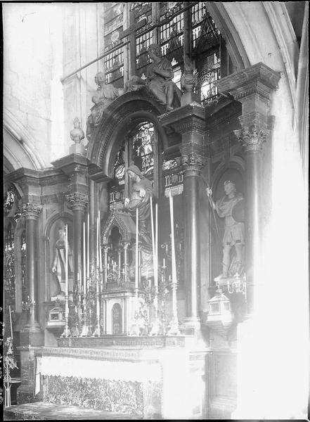 Retable de marbre polychrome composé de quatre grandes colonnes de marbre noir, encadrant deux hautres statues de bois de Saint Denis et Saint Victor. Au milieu il y a une arcade au-dessous de laquelle deux grandes statues allégoriques en marbre blanc sont à demi cannelées. Une plaque de marbre noir porte une inscription.