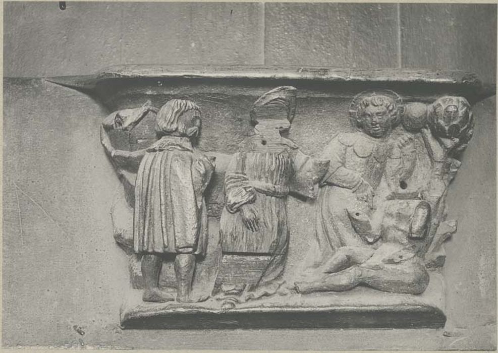 Oeuvre restaurée en 1997. Manques anciens : têtes des personnages sur les jouées ; quelques têtes et parfois des personnages entiers sur les miséricordes.