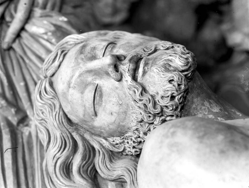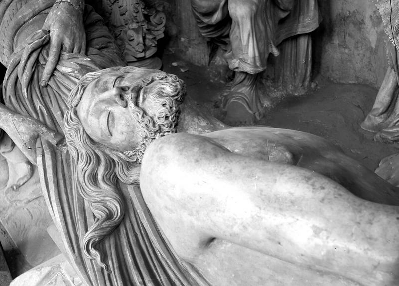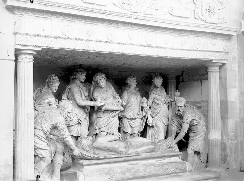 mise au tombeau ; résurrection du Christ ; les saintes femmes au tombeau ; colonne, caisson, rinceau, angelot, triglyphe
