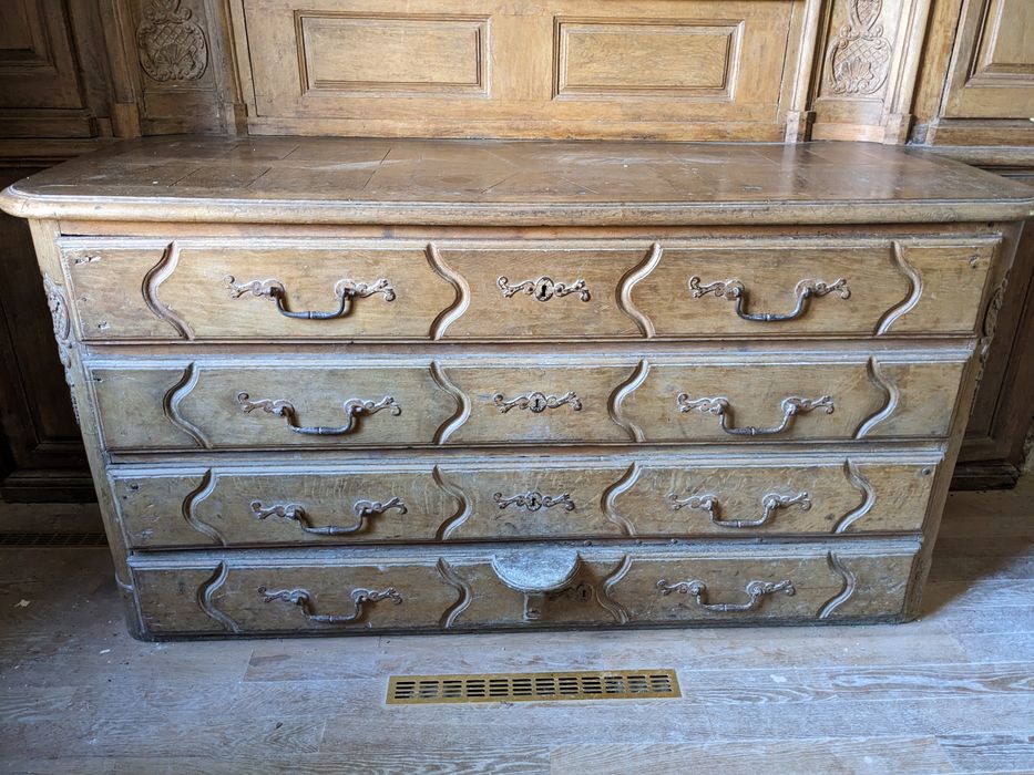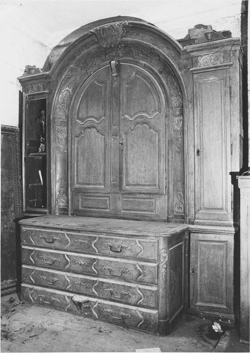 Bas de buffet : montants droits et angles antérieurs arrondis, quatre tiroirs séparés par des traverses ouvrent vers l'avant, des moulures en creux divisent leur façade en cinq sections, au centre entrée de serrure chantournée, de part et d'autre poignée tombante à retour extérieur. Le tiroir inférieur est muni d'un machre pied. Le plateau d'appui est formé d'un assemblage dessinant une croix pattée centrale encadrée de deux croix formées par l'intersection orthogonale de deux traverses. Corps supérieur : à deux portes à traverses chantournées s'inscrivant dans une voussure concave, corniche en arc segemntaire prolongée par des parties horizontales couvrant les placards latéraux. Deux placards latéraux : à deux portes superposées, l'une correspondant au corps du haut, l'autre au corps inférieur.