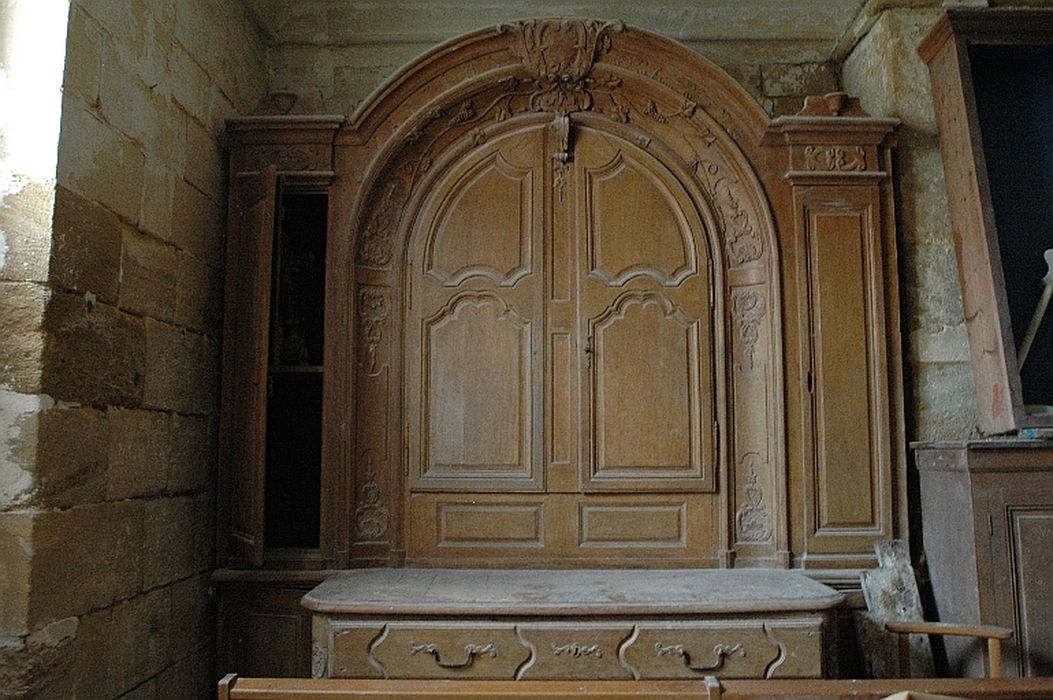 Bas de buffet : angles antérieurs ornés de chutes. Corps supérieur : voussure concave décorée d'épis de blé, de pampres de vignes et de chutes symétriques, d'Esprit régence, corniche décorée au centre d'un cartouche ovoïde entouré de feuilles déchiquetées et terminé par une agrafe en console avec chute appartenant au faux dormant de la porte dextre. Placard latéraux : simulant des pilastres avec entablement et frise décorée d'entrelacs