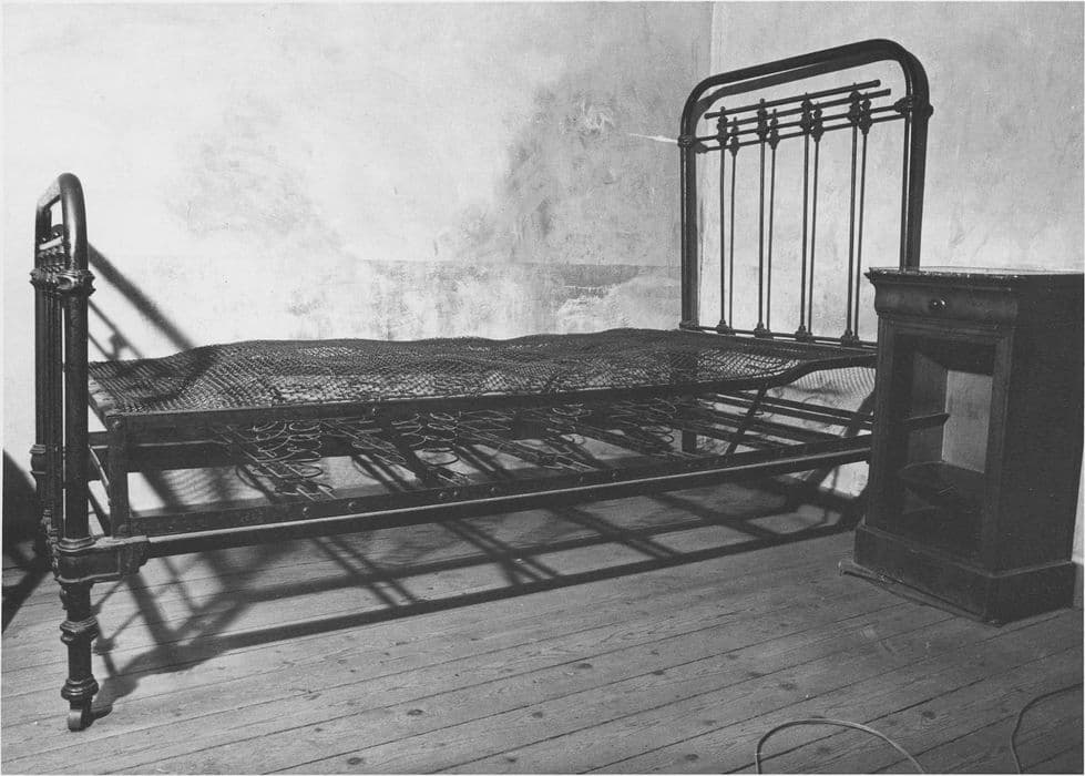 Panneaux de chevet et de pied tubulaires terminés par des roulettes, entretoisés de tubes de sections diverses. Longerons de section carrée. Sommier métallique.