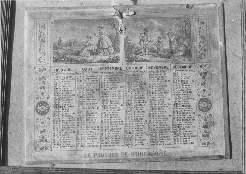 Calendrier illustré pour le deuxième semestre de l'année 1890, édité par le Progrès de Seine-et-Oise, dans un cadre en bois.