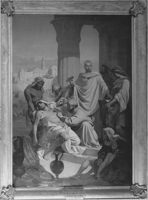 Jules Alexandre Duval le Camus (Paris 1814-Paris 1878). Cartouche du cadre : 'St Côme et St Damien guérissant le malade, fait pour l'église de Luzarches et offert par l'auteur en l'an MDCCCLII. Toile présentée au Salon de 1852.