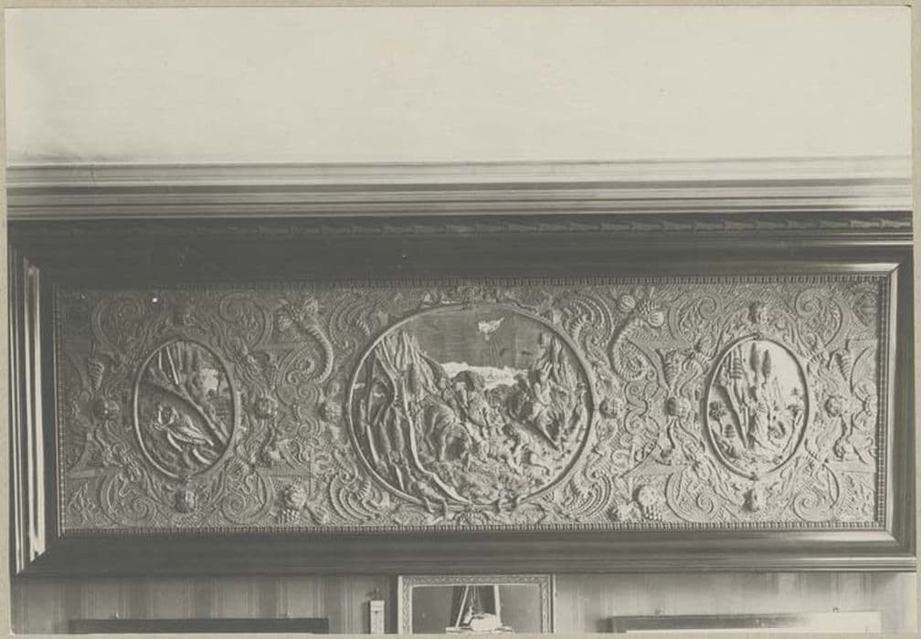 Antependium brodé en relief, comportant trois médaillons : Saint Paul sur le chemin de Damas, au centre, Sainte Madeleine, à gauche et Sainte Marthe, à droite.