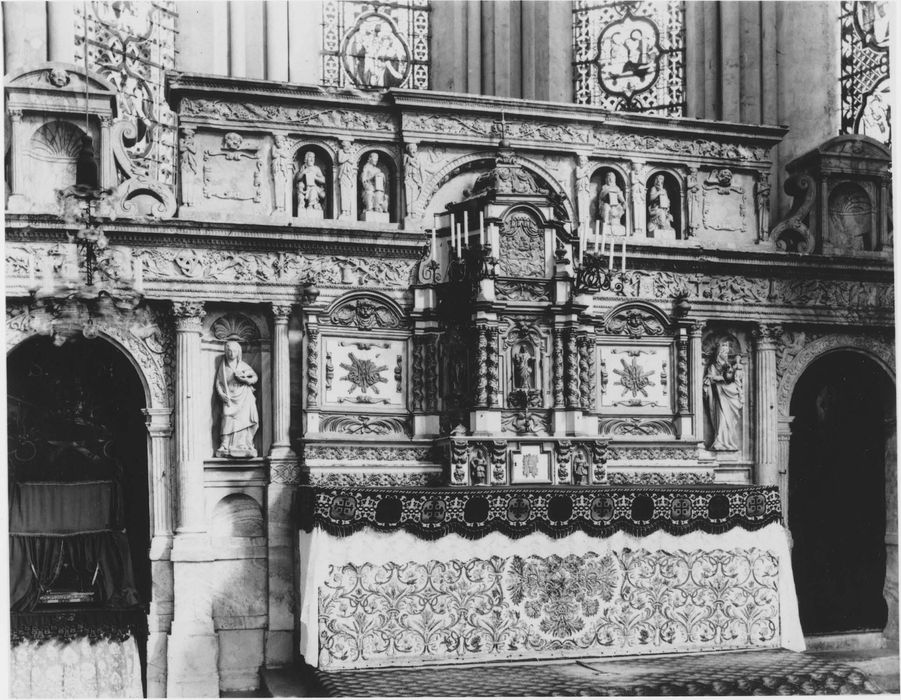 Ce tabernacle coiffé d'un dôme, accolé d'ailes et porté par des gradins, fut retiré du maître-autel (disposé contre la clôture de choeur formant retable et datant du 16e siècle) et remplacé par les peintures actuelles consacrées à la Crucifixion et à la famille du connétable Anne de Montmorency, éxécutées sur toile marouflée sur des cartons de Paul Gomez, à l'extrème fin du 19e siècle.