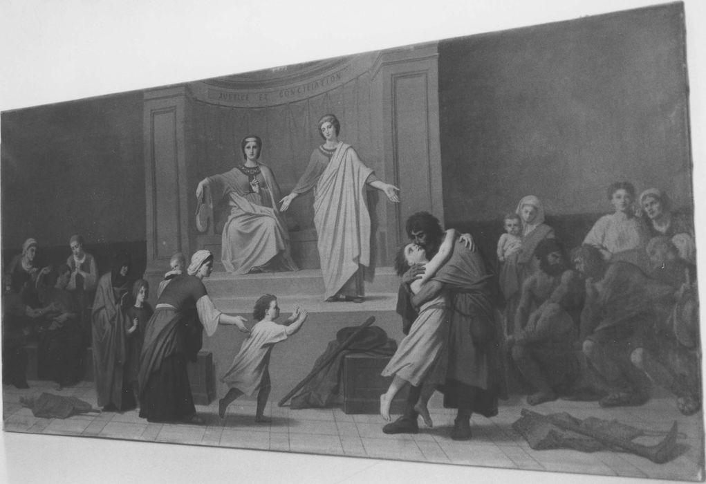 Emile Signol (1804-1892). Une étiquette, collée à l'arrière du cadre, porte l'inscription : 'Je donne ce tableau de la Justice à la mairie de Montmorency Ernestine Signol'. Il s'agit peut-être de ce tableau numéro 792 portant le titre 'La Justice', exposé (avec deux autres tableaux de Signol) à l'Exposition Universelle de 1878 à Paris. On relève, dans cette peinture, le style académique et volontairement archaïque d'Emile Signol.