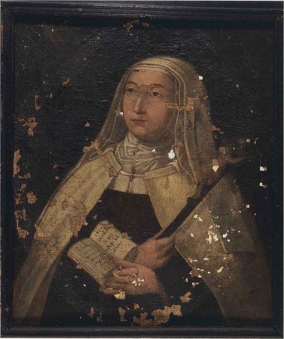 tableau : Marie de l'Incarnation en prière, avec un crucifix et un livre